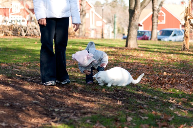 On Thanksgiving day we went to the little farm nearby, where Ashley likes to look at the animals. She mostly just stares quietly at length, as shown above, and then quickly runs over to a new animal to look at. Anyway, we were about to leave and a certain little animal caught Ashley’s eye: