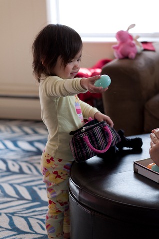 We were shopping with Ashley and to keep her entertained, we gave her some stickers. Most of them ended up on her shirt. A little while later, back at home having lunch in our kitchen, I noticed that the stickers were missing from her shirt. I asked Ashley, “Where did your stickers go?” She pointed to the front room and said, “Bango.”